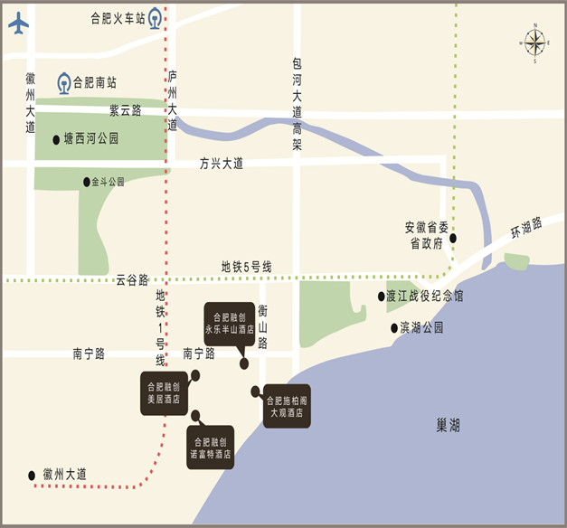 合肥施柏阁大观酒店毗临巢湖、融创乐园、融创水世界等。酒店交通便利,紧邻地铁1号线万达城站, 为您提供便利的出行方式。酒店周边配套设施完善,滨湖湿地森林公园、渡江战役纪念馆、环湖大道骑行、中庙姥山岛,舒适惬意的环境,远离城市的喧闹, 一次秘游旅行,一切尽在这里。